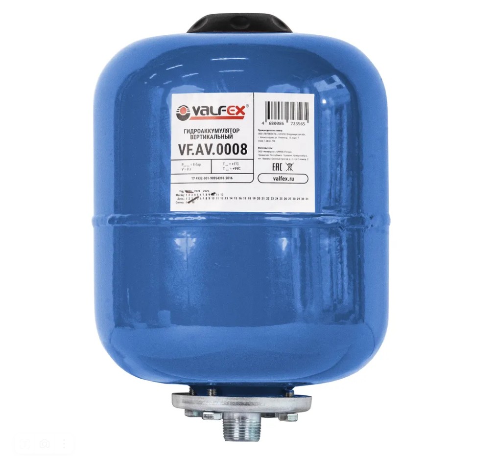 Мембранные баки VALFEX предназначены для систем холодного водоснабжения, в том числе – питьевого, с рабочим давлением до 8 бар. Допускается также их использование в системах горячего водоснабжения и отопления с температурой теплоносителя не более +99 градусов С. Заводское давление в газовой камере (преднастройка) – 2 бара. Баки объемом 50 – 100 л оснащены дополнительными опорами, что позволяет устанавливать баки на пол.