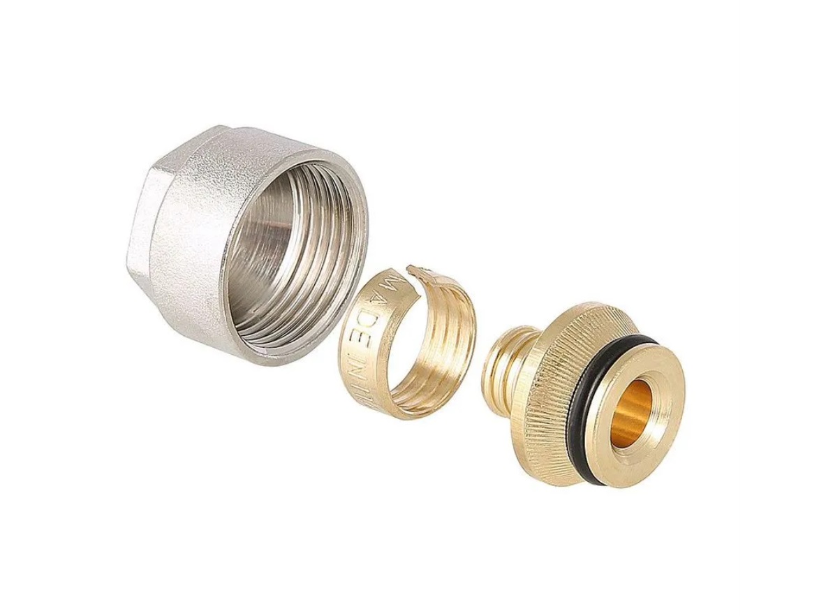 Евроконус для пластиковой трубы – латунный фитинг с накидной гайкой и обжимным кольцом с переходом на евроконус для подключения пластиковой (PE-X или PE-RT) трубы к коллектору.Стандарт резьбы накидной гайки по ГОСТу 6357-81. Соединения – «евроконус». Фитинг рассчитан на рабочее давление (PN) 1,0 МПа и температуру транспортируемой среды до +110 °С. Евроконус имеет уплотнительное кольцо, выполненное из EPDM.