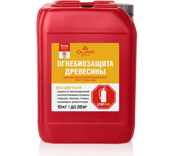 Огнебиозащита OLIMP ОгнебиоII бесцветный, 10 л - пропитка переводит древесину в трудновоспламеняемый и трудногорючий материал в соответствии с ГОСТ P 53292-2009 и 2 группой огнезащитной эффективности. Защищает деревянные элементы строений, конструкций и изделий: обшивки, стены, черновые полы, потолки и другие элементы. Огнезащитный эффект до 5 лет. Биозащитный эффект до 10 лет.