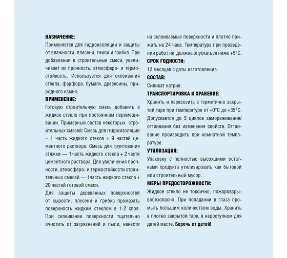 ПОДГОТОВКА ПОВЕРХНОСТИ Поверхность должна быть прочной, чистой и сухой ПРИМЕРНЫЙ СОСТАВ НЕКОТОРЫХ СТРОИТЕЛЬНЫХ СМЕСЕЙ Смесь для гидроизоляции: 1 часть жидкого стекла + 9 частей цементного раствора Смесь для грунтования стяжки: 1 часть жидкого стекла + 2 части цементного раствора Смесь для увеличения прочности, атмосферостойкости, термостойкости строительных смесей: 1 часть жидкого стекла + 20 частей готовой смеси СПОСОБ НАНЕСЕНИЯ Перед применением тщательно перемешать. Готовую строительную смесь добавить в жидкое стекло при постоянном перемешивании. Для защиты деревянных поверхностей от сырости, плесени и грибка промазать поверхность жидким стеклом в 1-2 слоя. При склеивании поверхности тщательно очистить от загрязнений и пыли, нанести на склеиваемые поверхности и плотно прижать на 24 часа. Температура при проведении работ не должна опускаться ниже +5°C. МЕРЫ ПРЕДОСТОРОЖНОСТИ Не токсично, пожаровзрывобезопасно. При попадании в глаза промыть большим количеством воды. Хранить в плотно закрытой та