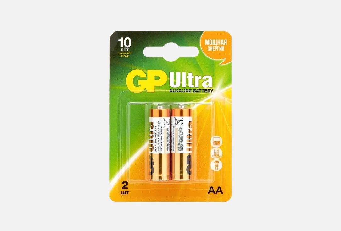 Батарейка GP Ultra Alkaline АА (LR6) 2 шт. (15АU-CR2) Батарейки Ultra Alkaline AA предназначены для устройств, нуждающихся в повышенном потреблении энергии. Это фотоаппараты, микрофоны, диктофоны, аудио устройства, фотовспышки, цифровые камеры, радиоуправляемые модели, игровые консоли и т.п. Батарейки GP хранятся в 3,5 раза дольше обычных солевых батареек. Они сохраняют рабочие свойства в течение семи лет, тогда как солевые теряют заряд всего за два года. Компактная блистерная упаковка из двух батареек – это удобный мини-запас для ваших устройств, который легко взять с собой в любую поездку, на отдых или на дачу. - Батарейки работают на основе марганцево-цинковой системы и не содержат тяжелых металлов, в результате чего безвредны, как для людей, так и для окружающей среды. - При установке в приборы соблюдайте полярность. Не используйте в устройствах батарейки разных размеров. - Эксперты GP не рекомендуют устанавливать для работы новые батарейки одновременно с уже использованными: это ухудшает работу эле