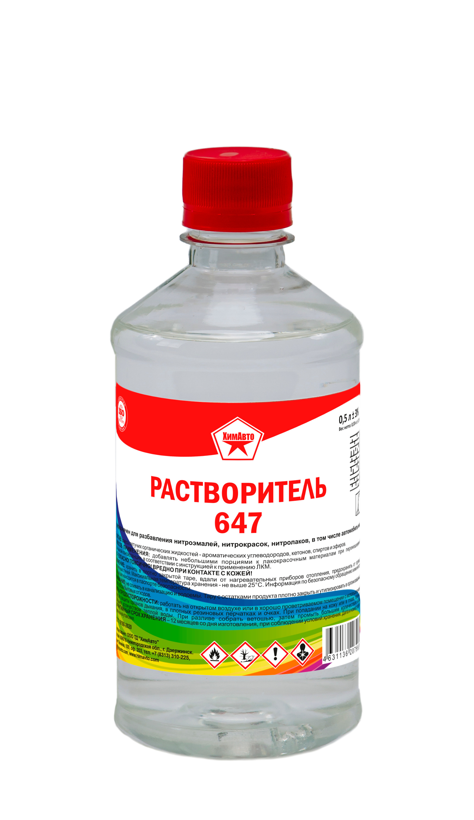 Растворитель 647 разработан для удаления лаков и лакокрасочных покрытий, для растворения нитроцеллюлозных пленкообразователей. Широко применяется в качестве растворителя для кузовных работ. Назначение: для удаления лаков и лакокрасочных покрытий, для растворения нитроцеллюлозных пленкообразователей. Пригоден для разбавления нитроэмалей и нитролаков, используемых при покраске автомобилей.