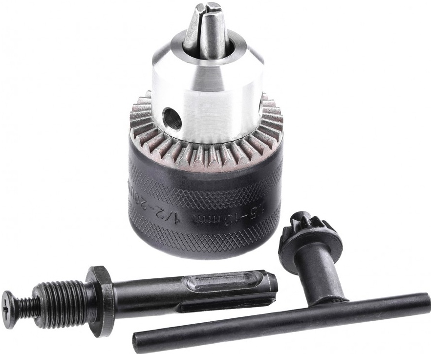 Патрон сверлильный ключевой предназначен для крепления на перфоратор оснастки с цилиндрическим хвостовиком. Некоторые особенности и назначение такого патрона: Применяется для зажима свёрл, буров, концевых фрез и другого режущего инструмента с цилиндрическим, трёх- или шестигранным хвостовиком. Подходит для ударных электрических, аккумуляторных и ручных дрелей с посадочной резьбой 1/2". 1 В комплекте идёт переходник SDS-plus, который позволяет устанавливать патрон в перфоратор, использующий буры с хвостовиком типа SDS+. Имеет цельнометаллический корпус и ударопрочную конструкцию, что обеспечивает прочность и надёжность при длительных и интенсивных работах. Оснащён быстрым зажимным механизмом, который обеспечивает быструю замену и фиксацию свёрл.