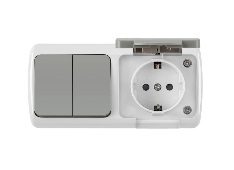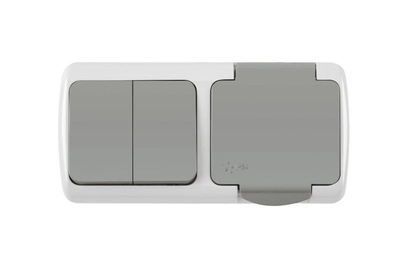 Блок розетка с/з с крышкой + 2 кл выключатель серый ОП, IP54 VKL electric