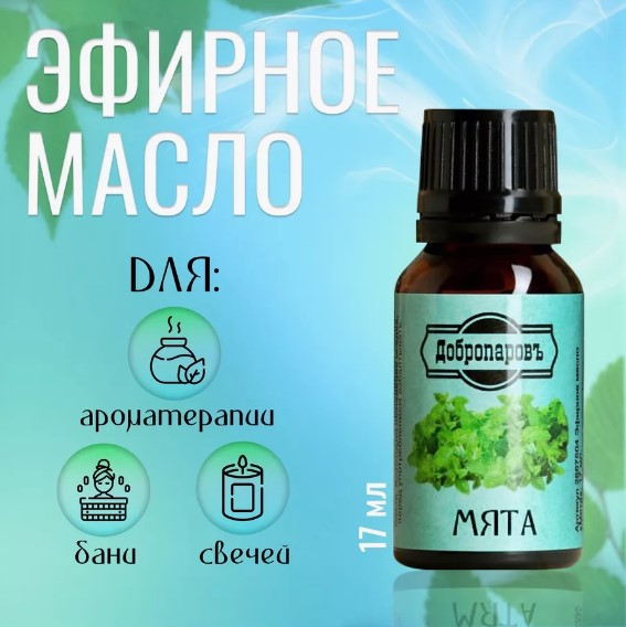 Эфирное масло «Мята» в флаконе-капельнице предназначено для ароматерапии. Некоторые области применения и предполагаемые эффекты от использования масла: защита от вирусов и бактерий, снятие жара и воспалений; избавление от тошноты, головокружения, симптомов морской болезни; облегчение болей в сердце при неврозах, стенокардии, тахикардии, аритмии; нормализация пищеварения, избавление от изжоги и коликов; спазмолитический эффект, устранение головной боли, связанной с переутомлением и гипоксией; отхаркивающее действие при заболеваниях дыхательных путей; купирование боли при кариесе и пульпите, воспалении дёсен, стоматите, устранение дурного запаха изо рта; помощь при мышечной боли. Некоторые способы применения: ароматизация воздуха (4–6 капель на 15 м²); аромамедальон (2 капли); ванна при простудных заболеваниях (3 капли мяты и 2 капли лаванды на ½ стакана сливок); сауна (2–4 капли на 15 м²); обогащение косметических препаратов (6 капель на 15 г основы); ингаляция при кашле, насморке, охриплости, угревой сыпи (2 капли мяты и 3 капли лаванды на 2 л горячей воды); массаж (6 капель на 15 г транспортного масла).