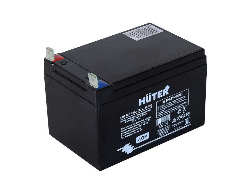 Аккумуляторная батарея Huter 12В 12А предназначена для запуска бензиновых электрогенераторов, оснащённых электрическим стартером. Могут применяться, так же, и для другой бензиновой техники со схожими техническими параметрами. Аккумуляторы Huter изготовлены при помощи технологии AGM (Absorbent Glass Mat), отличие батарей AGM от классических в том, что в них содержится абсорбированный электролит, а не жидкий, что даёт ряд преимуществ в свойствах аккумулятора. Данный аккумулятор продойдет для генераторов DY6500, DY8000, DY9500.