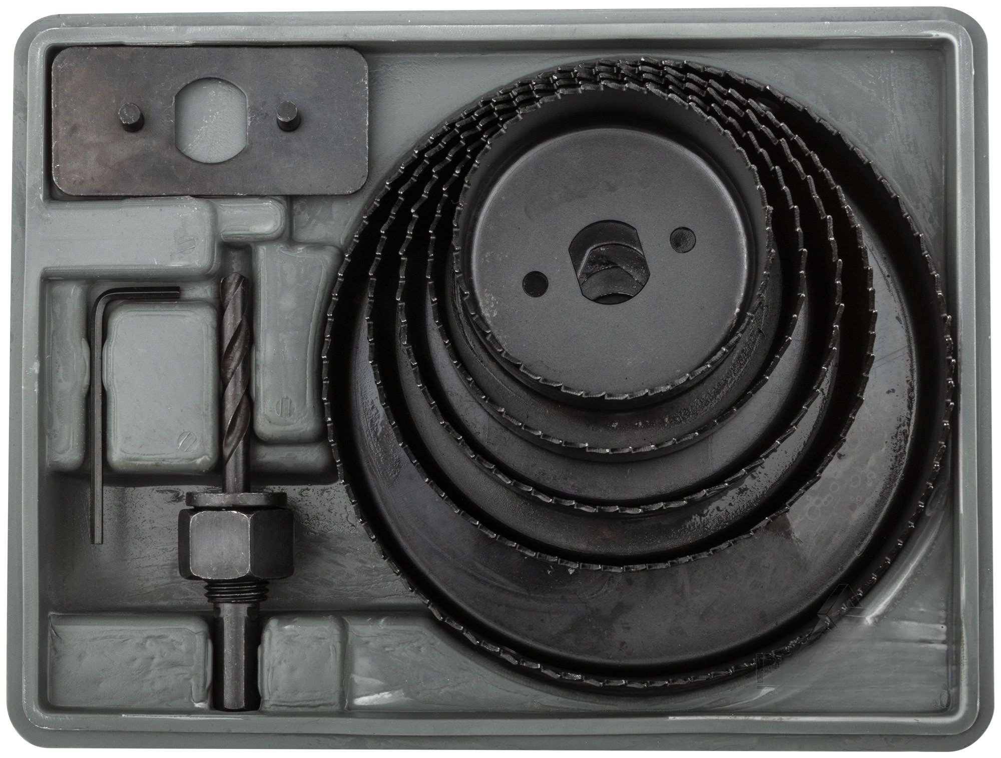Усиленный адаптер. Профи. Для высверливания отверстий в древесине твердых и мягких пород, ДСП и фанеры. В наборе 5 пил круговых (64-76-89-102-127) Материал инструментальная сталь.