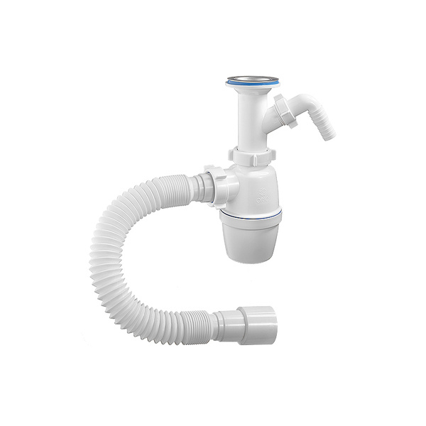 В комплекте идёт полированная нержавеющая чашка д.70мм. Сифон комплектуется нержавеющим винтом длиной 75мм и нержавеющей гайкой М6. Гибкий отвод позволяет подключить слив сифона к канализации с диаметрами 40 или 50мм. Отвод для подключения стиральной/посудомоечной машины имеет два диаметра подключения 19 и 22мм. Так же имеется заглушка отвода подключения бытовой техники, на случай её не использования.