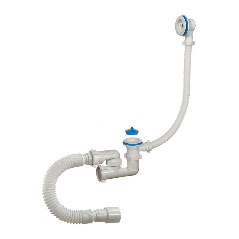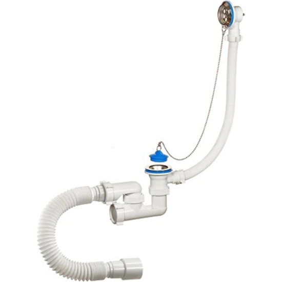 Сифон 1 1/2"х40, с переливом и нержавеющими чашками, для ванн и глубоких душевых поддонов. Конструкция сифона позволяет прочищать сифон, не демонтируя. В комплекте латунная цепочка с пробкой. Отвод в канализацию гибкая труба 40 – 40/50