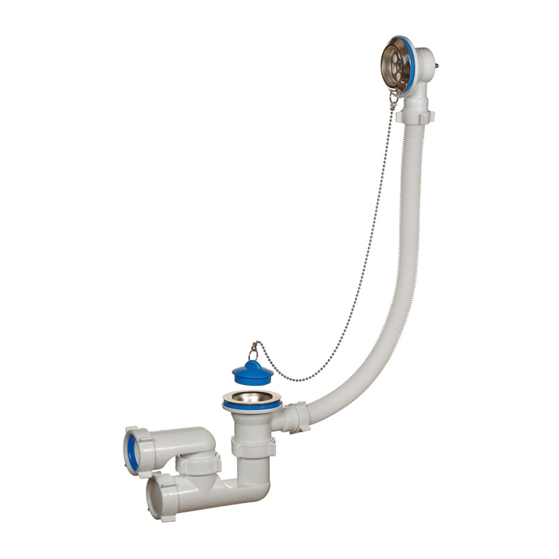 Сифон 1 1/2"х40, с переливом и нержавеющими чашками, для ванн и глубоких душевых поддонов. Конструкция сифона позволяет прочищать сифон, не демонтируя. В комплекте латунная цепочка с пробкой. Необходим отвод в канализацию.