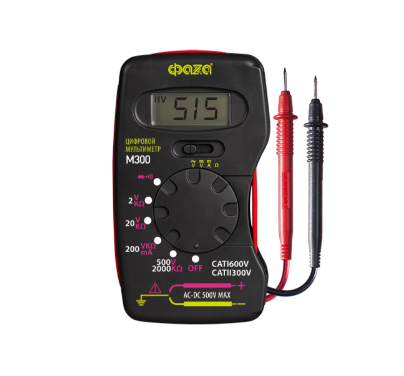 Мультиметр цифровой M300 ФАZА выпускается в компактном корпусе, изготавливаемом из прочного ABS-пластика черного цвета. Вес изделия без учета батареи составляет 80 грамм. Специальная форма обеспечивает удобный захват устройства. В конструкции предусмотрен отсек для щупов. Мультиметр поставляется с источником питания 23А. Продукт соответствует категории безопасности КАТ II.При помощи изделия производятся измерения напряжения, сопротивления и постоянного тока, а также прозвонка соединений и диодный тест. Прибор защищен от перегрузок. Индикатор сигнализирует о разряде батареи, возникновении перегрузки, а также показывает полярность.