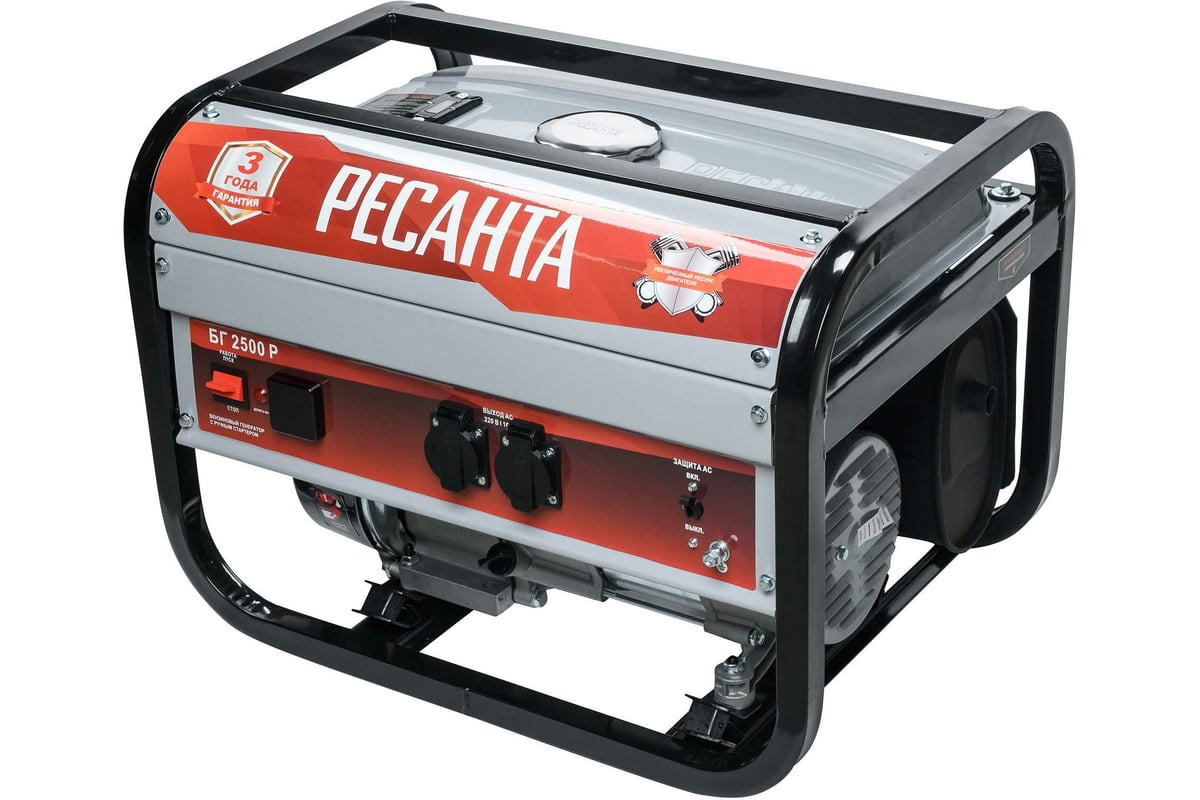 Электрогенератор Ресанта БГ 2500 Р предназначен для автономного электроснабжения потребителей бытового назначения. Электрогенератор бензиновый однофазный, выходная мощность 2000 Вт, выходное напряжение 220 Вольт. В качестве первичного источника используется карбюраторный двигатель, топливом для которого является неэтилированный бензин.