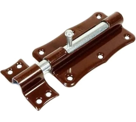 Задвижка накладная представляет собой классический шпингалет и пользуется большой популярностью. Изделия этого типа используются для запирания дверей в жилых домах, административных зданиях, на производственных объектах и т. п. Конструктивно шпингалет состоит из трех частей: корпуса, ригеля и ответной планки. Конструкция корпуса обеспечивает надежную фиксацию ригеля в закрытом и открытом положениях. Крепление корпуса и ответной планки осуществляется саморезами. Декоративно-защитное покрытие (полимер коричневый) в отличие от цинкового покрытия защищает изделия от коррозии в несколько раз дольше.