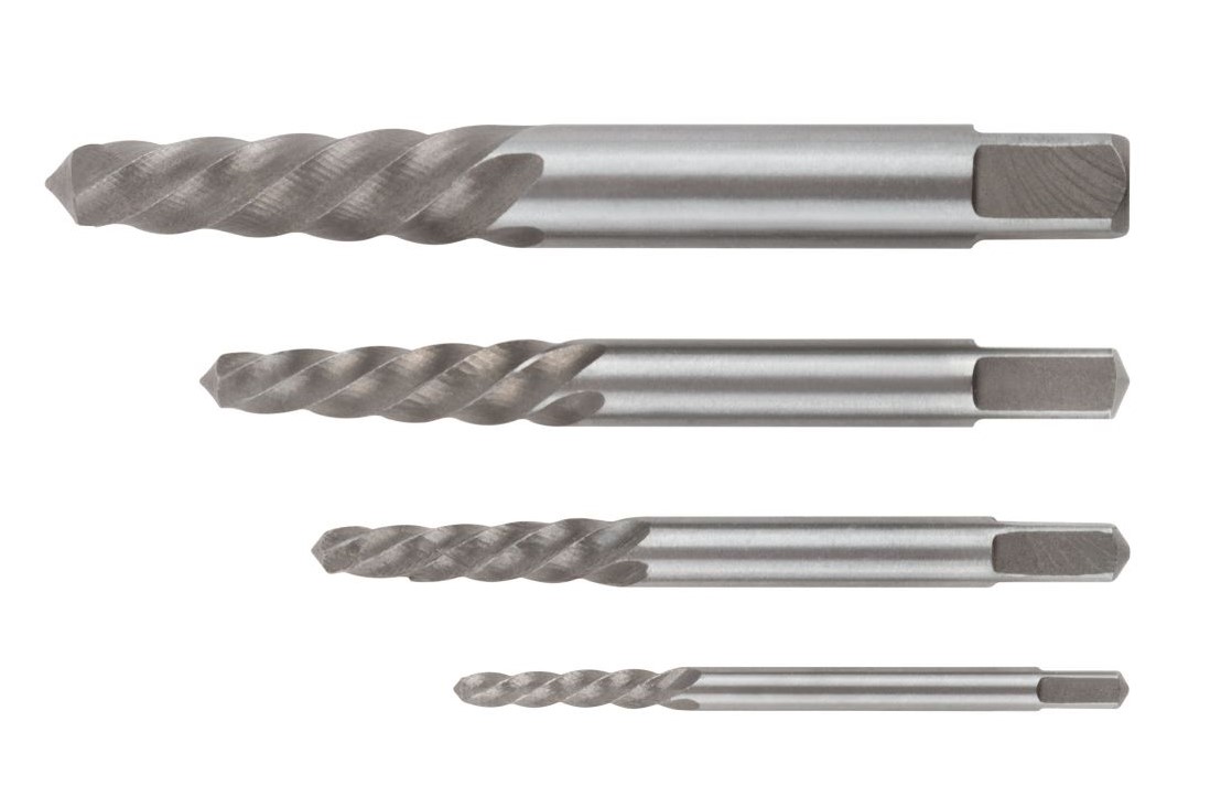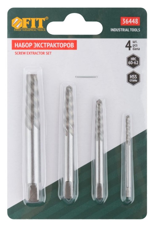 Набор экстракторов «Профи» из быстрорежущей (HSS) стали, состоящий из 4 штук, предназначен для извлечения шурупов и болтов с заломанными (сорванными) шлицами.