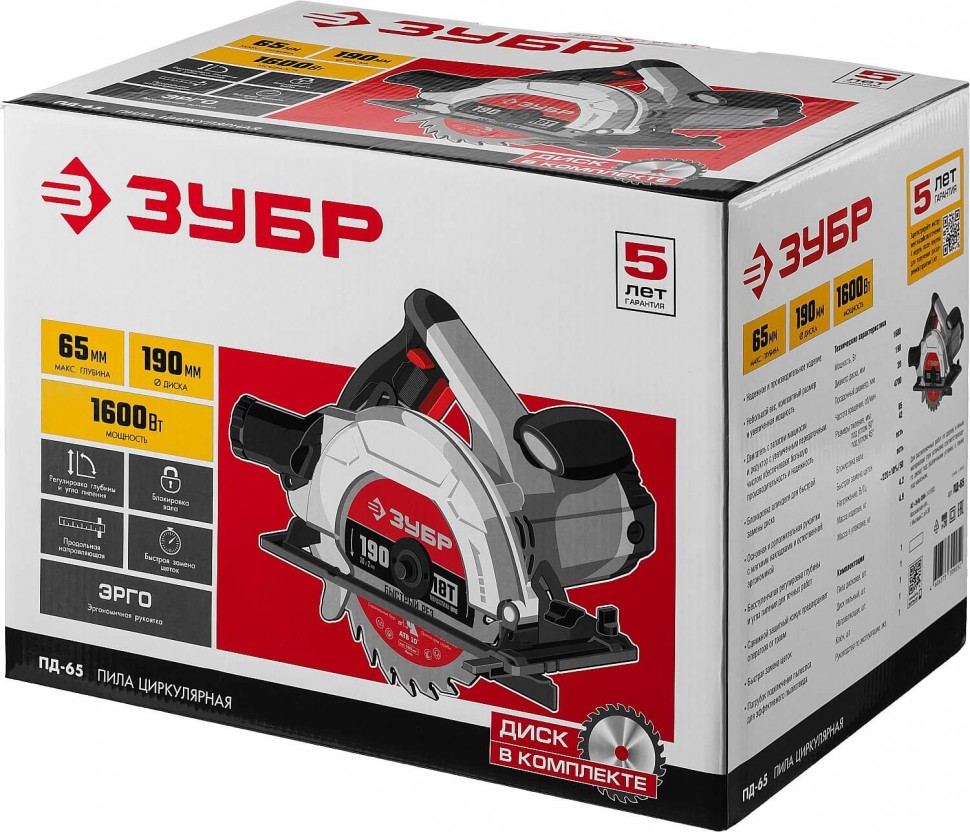 Циркулярная пила для всех видов распиловочных работ в серии профессионального инструмента ЗУБР. Максимальная глубина пиления 65 мм позволяет пилить все виды фанеры, любые листовые материалы, а также большинство типоразмеров досок. Жесткость конструкции обеспечивает точность пиления, а удобные рычаги фиксации выбранных настроек и оптимальная эргономика рукояток помогают работать быстрее и комфортнее.