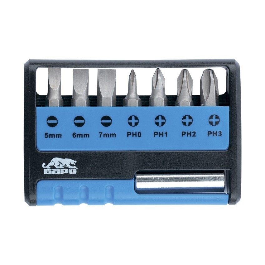 Профессиональный набор Барс 13357 включает 7 бит и магнитный держатель. С его помощью можно производить монтажные и демонтажные работы с крепежом разного типа: PH 0, 1, 2, 3 и SL 5-7. Благодаря правильной геометрии оснастка не теряет эксплуатационных свойств даже при интенсивных нагрузках.