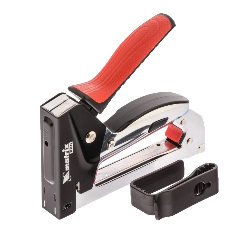 Стальной мебельный степлер Matrix PRO 40916 с механизмом быстрой загрузки скоб позволяет быстро зафиксировать на деревянном основании фанеру, оргалит, ДВП, ДСП, пленку ПВХ или изоляционный материал с помощью скоб 53 размером 6-10 мм. Инструмент используют для обивки или сборки мебели, проведения теплоизоляционных и отделочных работ, укладки ковровых покрытий.