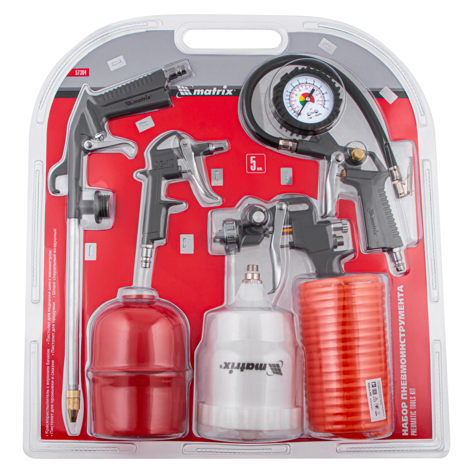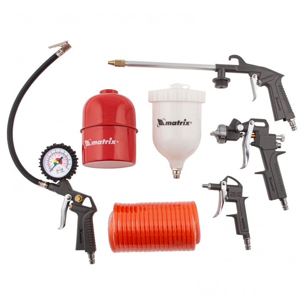 Набор пневмоинструмента MATRIX 57304 содержит 5 предметов. Он используется при покрасочных, промывочных и продувочных операциях, а также при подкачивании шин. Набор пригодится для работы в гараже, домашней мастерской, автосервисе, на мебельном производстве и при мелких посадочных работах. Подходит для всех видов пневматических компрессоров.