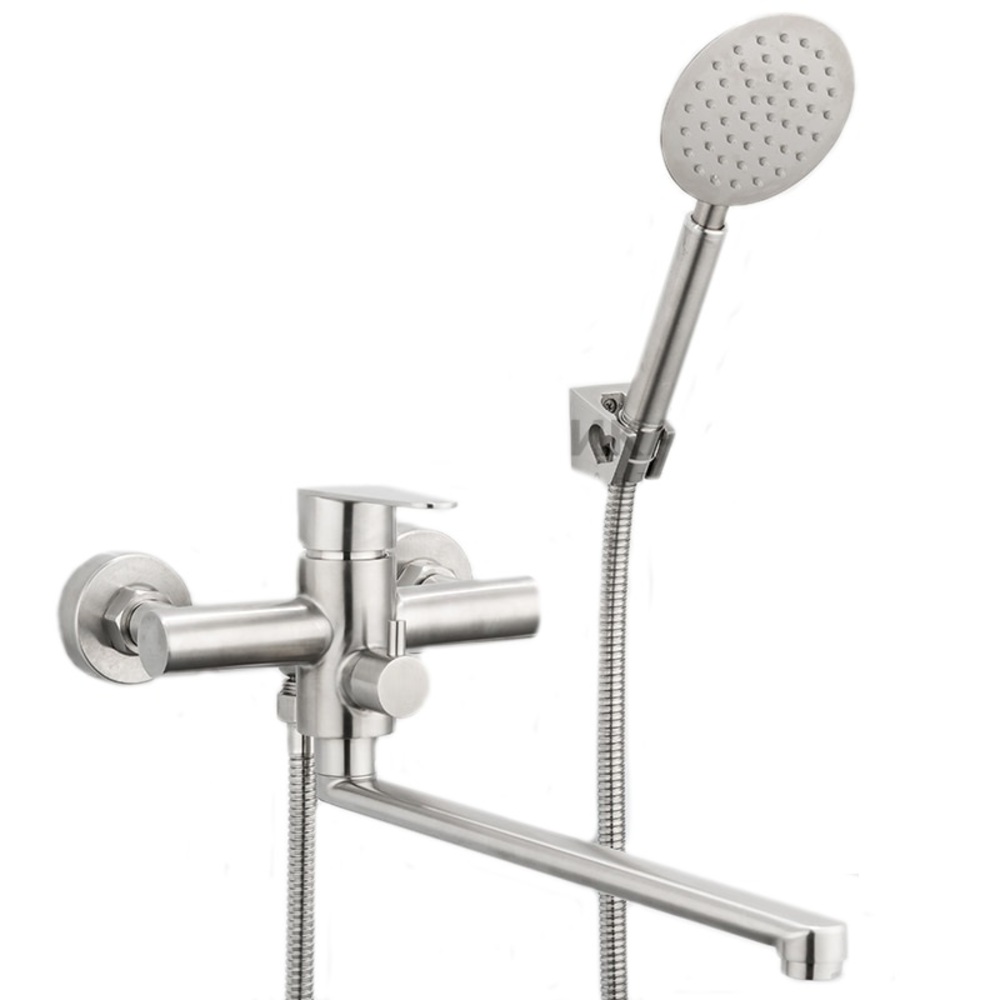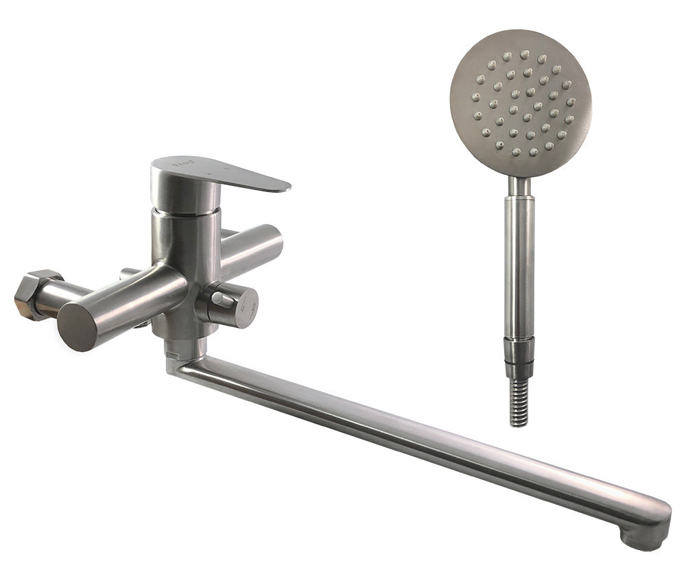 Смеситель для ванны Frap H48 F2248 универсальный, с душевым гарнитуром. Характеристики: Цвет: сатин. Материал: нержавеющая сталь. Управление: однорычажное. Механизм: керамический картридж. Излив: поворотный. Монтаж: на стену. Тип подводки: жесткая. Стандарт подводки: G 1/2. Длина шланга: 1500 мм. В комплекте поставки: Смеситель для ванны. Душевой шланг. Душевая лейка. Держатель лейки. Комплект отражателей. Комплект эксцентриков.
