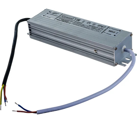 Драйвер светодиодный TM General со степенью защиты IP67 выполнен в компактном и герметичном металлическом корпусе, снабжен защитой от перегрузок и короткого замыкания, а также предназначен для работы в диапазоне от 110 до 240 Вольт.