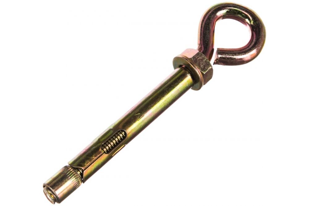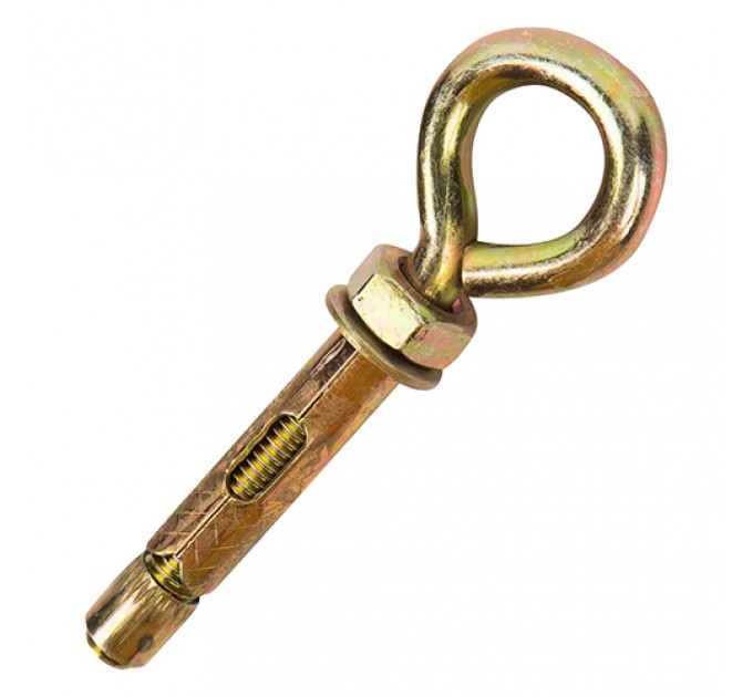 На конце болта расположено кольцо. При монтаже оно служит опорой для вертикально закрепляемого груза. Метод, как установить анкерный болт с кольцом, не отличается от технологии монтажа предыдущих видов крепежа. Анкер устанавливается в просверленное монтажное отверстие. При закручивании стержня втулка распирается и надежно фиксируется в теле материала.