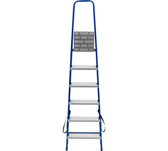 Стремянка СИБРТЕХ 6 ступеней 97956 имеет стальные опорные направляющие и алюминиевые ступени. Широкие профилированные ступени обеспечивают безопасный спуск/подъем, удобство при длительной работе на высоте. Изделие оснащено пластиковыми рифлеными наконечниками, которые исключают скольжения по поверхности и не повреждают покрытие пола. Благодаря наличию высокой дуги работник может безопасно выполнять различные высотные работы.