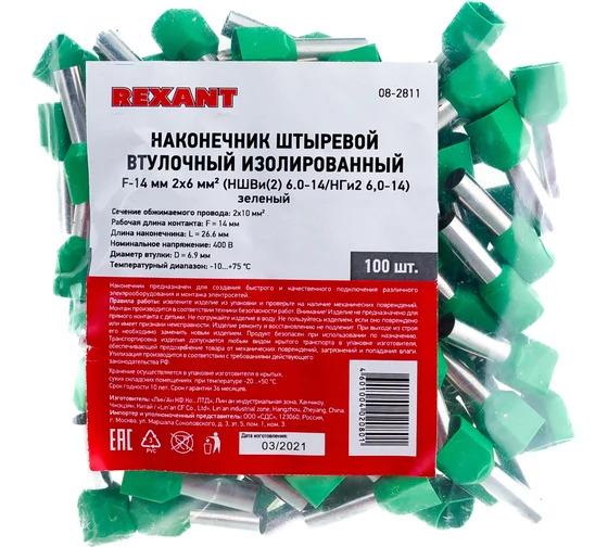 Наконечник штыревой втулочный изолированный (НШВИ F-14 мм) 2х6 мм² зеленый REXANT предназначен для создания быстрого и качественного подключения различного электрооборудования и монтажа электросетей. Такой современный способ подготовки кабеля к соединению заменяет процесс облуживания или скрутки многожильных медных проводов, формируя целостное окончание кабеля с последующим подключением промышленного или бытового электрооборудования. Втулочный наконечник состоит из латуни, с поверхностным электролитическим лужением, и рассчитан на монтаж 2 проводников с соответствующим сечением под опрессовку. Предварительно зачищенные жилы заводятся внутрь латунной втулки и обжимаются специальными пресс-клещами (ht-8164 арт.12-3206; ht-301S арт.12-3119, 12-3019, 12-3019-4) в считанные секунды. Для удобства заведения многожильных проводов внутрь латунной втулки предусмотрена манжета конической формы, изготовленная из поливинилхлорида (ПВХ), обеспечивающая надежную защиту соединения от влаги и других внешних воздействий.