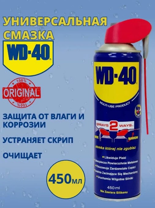 Универсальная смазка WD-40 объёмом 450 мл — многофункциональное средство в виде спрея. Некоторые области применения: Обработка резьбовых соединений. Смазка удаляет коррозию, за счёт чего любые болты или гайки становится проще открутить. Обработка клемм и электрических соединений. В составе WD-40 присутствуют минеральные компоненты, которые не допускают проникновения влаги на обработанную поверхность. Обработка трущихся соединений. WD-40 снижает трение за счёт масляной плёнки. Обработка различных замков в зимний период. Смазка позволяет разморозить соединения. Избавление от скрипов или заполнение микротрещин. Средство подходит для разных видов техники: авиатехника, внедорожники, водная техника, гидроцикл, грузовые автомобили и автобусы, картинг, квадроциклы, коммерческий транспорт, легковые автомобили, мопеды.
