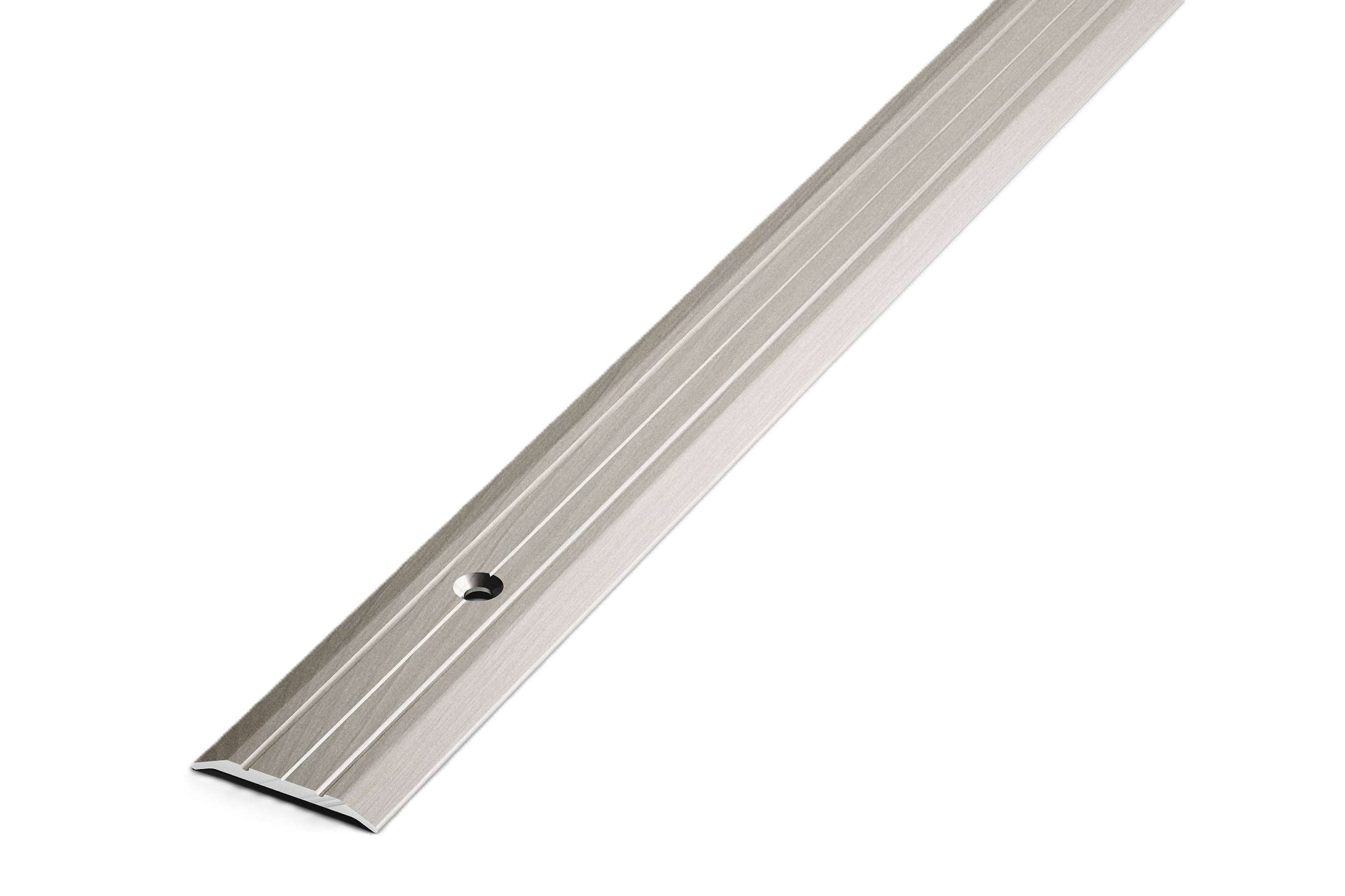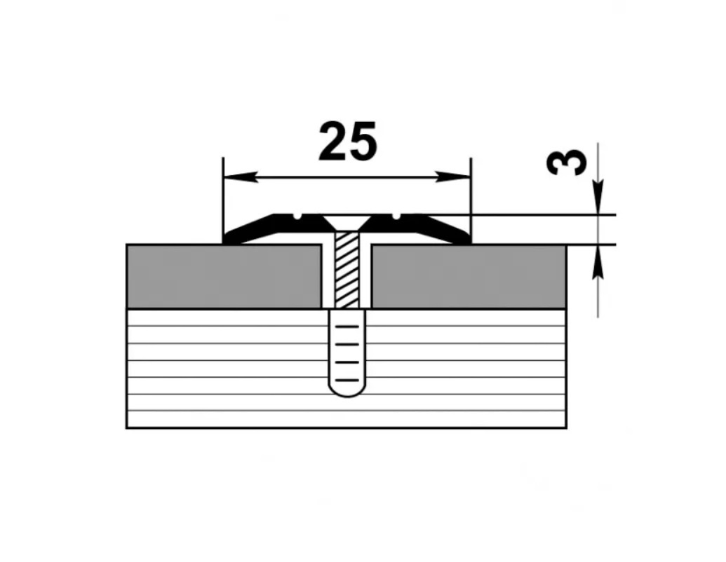 Профиль-порог напольный одноуровневый стыкоперекрывающий алюминиевый, ширина 25 мм, высота 3 мм, длина 1,35 м. Предназначен для декоративной стыковки одноуровневых напольных поверхностей. Представляет собой плоский напольный порожек из алюминия с двумя желобками в качестве рифления, с отверстиями для крепления, крепеж в комплекте.