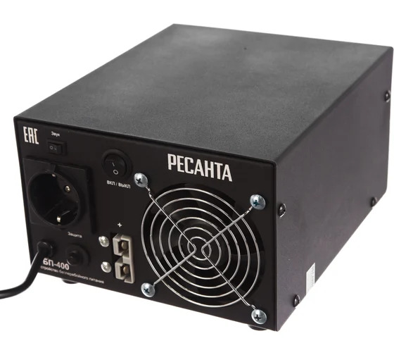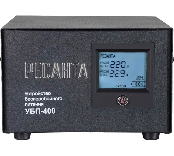 Устройство бесперебойного питания Ресанта УБП-400 мощностью 300 Вт обеспечит защиту от скачков напряжения и резервное питание электрооборудования в случае временного отключения электричества. Наличие в устройстве автоматического стабилизатора напряжения позволяет защищать охранные системы, компьютерное, котельное и другое оборудование от негативных последствий, вызванных скачками напряжения, без включения резервных аккумуляторов. Заряд ИБП может использоваться для кратковременного обеспечения электроэнергией включенных приборов. В устройстве предусмотрено несколько режимов работы. Сетевой режим предполагает наличие входного напряжения в пределах 140-260 В. При полном отсутствии тока или при отклонении напряжения от нормальных показателей устройство переходит в автономный режим и продолжает обеспечивать работу подключенного электрооборудования за счет ресурса АКБ. О переходе на резервное питание можно узнать по периодичному звуковому сигналу, который станет более частым за 2 мин до полного отключения бесперебойника. Режим холодного старта используется в исключительных ситуациях для включения автономного питания. Для запуска следует длительно жать на кнопку «Ожидание сети», расположенную под экраном. Источник бесперебойного питания будет полезен в местах, где важно следить за стабильностью сети и бесперебойным энергоснабжением оборудования. Небольшая, но эффективная модель Ресанта УБП-400 подойдет для газовых котлов, компьютерного, осветительного и другого оборудования.