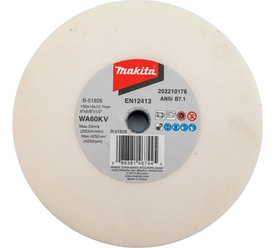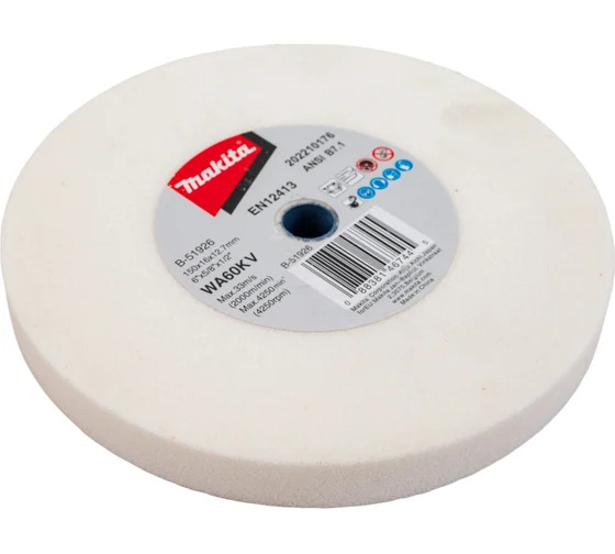 Шлифовальный круг Makita B-51998. Диаметр диска 150 мм, толщина 16 мм, внутренний диаметр 12.7 мм, зернистость WA60KV. Максимальная скорость вращения 33 м/с (2000 м/мин), частота вращения 4250 об/мин. Зерна этого шлифовального круга состоят из белого оксида алюминия, что делает его подходящим для обработки, таких как нержавеющая сталь, HSS или острие инструментов. Он также может быть применен к алюминию с высокой прочностью на растяжение или проточкам в деталях. Диск имеет зерно 60 и, следовательно, подходит для шлифования долот.