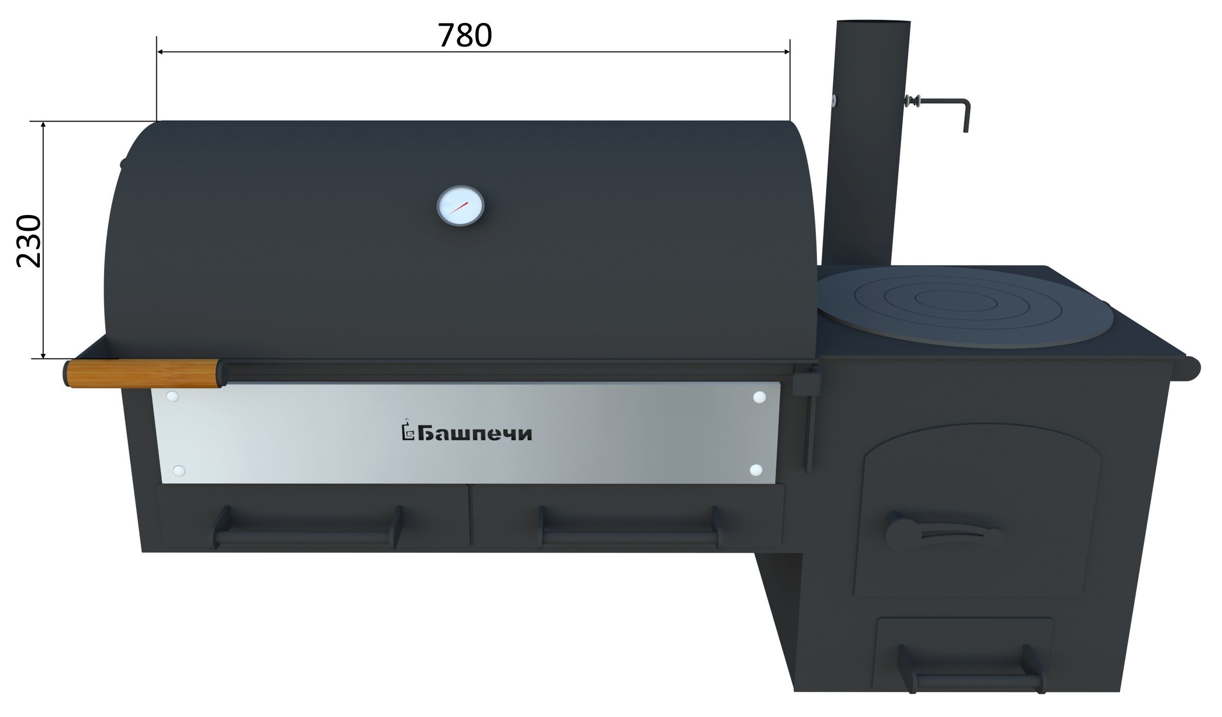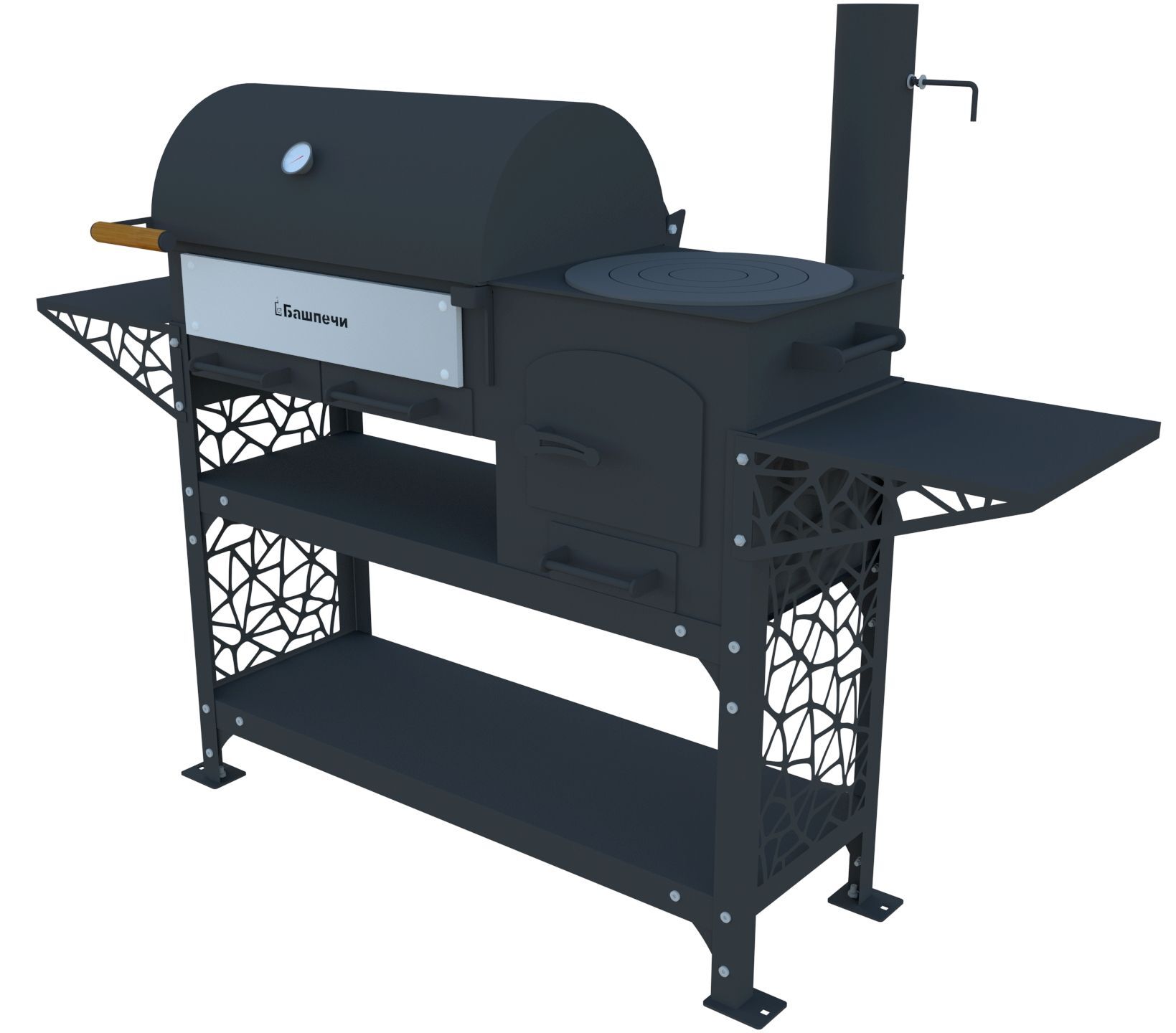 Печь ПКМ-смокер профи с подставкой – это барбекю не традиционной формы, со сферической крышкой и ровным перфорированным дном, это оригинальная конструкция, разработанная нашими специалистами и подтвержденная патентом, обеспечивающая наиболее равномерное термическое воздействие на продукт сверху (при закрытой крышке) за счет подачи, удержания и контроля температуры нагрева; с боков и снизу, за счет выделения температуры от разогретых углей в жаровне, либо только от подачи горячих дымовых газов от горения дров в совмещенной печи. В ПКМ-смокер при открытой крышке термическое воздействие осуществляется только снизу. Печь ПКМ-смокер профи изготовлена из листовой стали толщиной 5мм (дно мангала и топки, верх топки и дверца топки, задвижка между топкой и мангалом), 4мм (все вертикальные части ПКМ-смокера профи и дно зольных коробок), 2 мм и 1,5 мм (крышка мангала). Подставка под ПКМ-смокер профи изготовлена из листового металла толщиной 1,5 мм