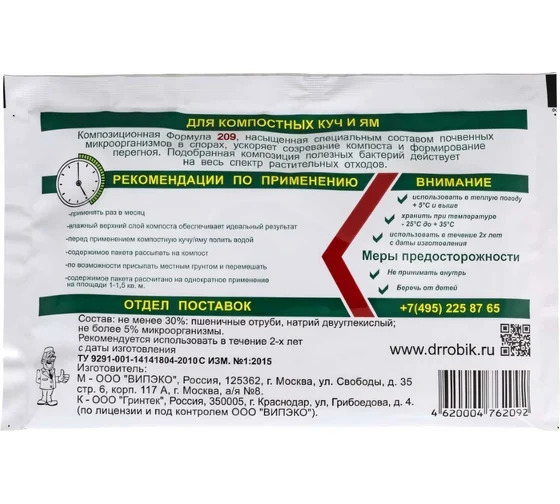 Биоактиватор ускоритель компоста Доктор Робик 209 - регулярное применение раз в месяц позволит получать обогащенный питательными веществами компост в короткие сроки. В результате распада получается сбалансированный компост, который является прекрасным средством для подкормки и пересадки растений. Простой в использовании Доктор Робик 209 не содержит едких веществ, безвреден для окружающей среды.